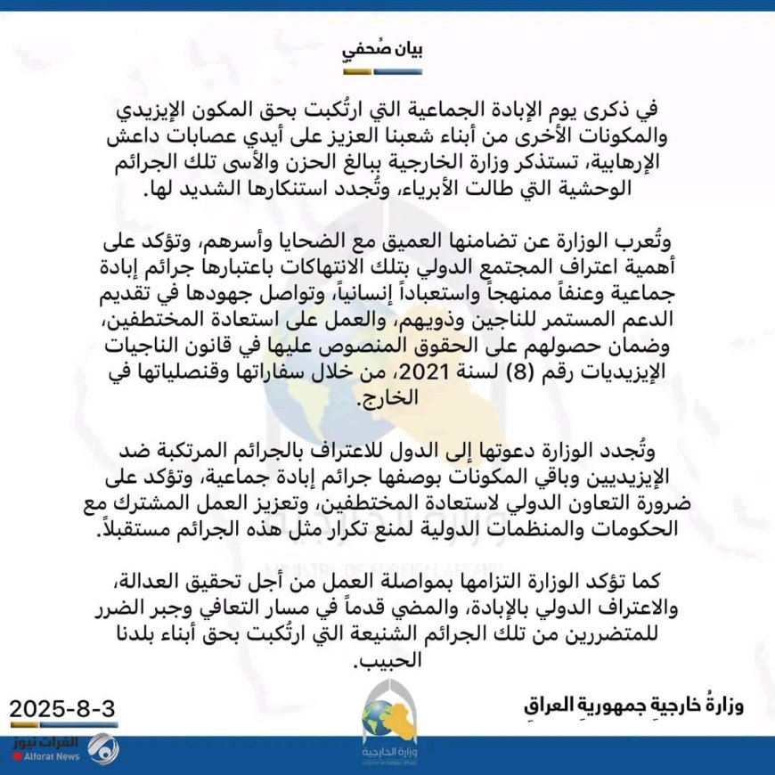 في الذكرى السنوية ليوم الإبادة الجماعية للمكون الإيزيدي والمكونات الأخرى، استذكرت وزارة الخارجية العراقية ببالغ الحزن الجرائم الوحشية التي ارتكبتها عص