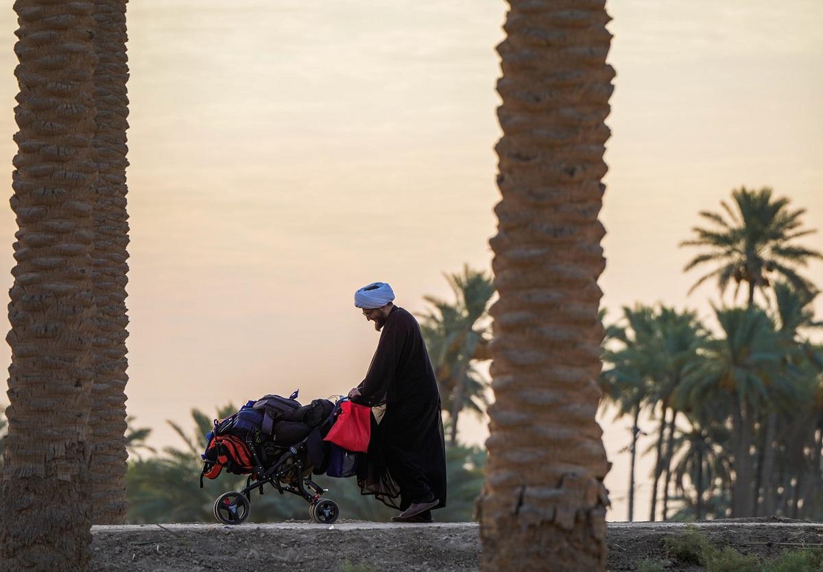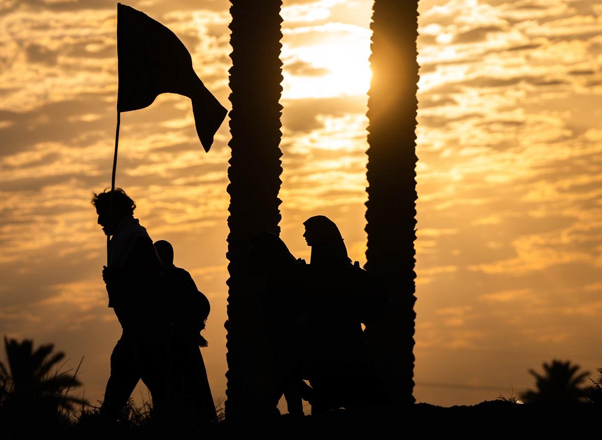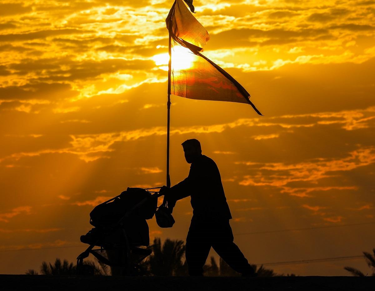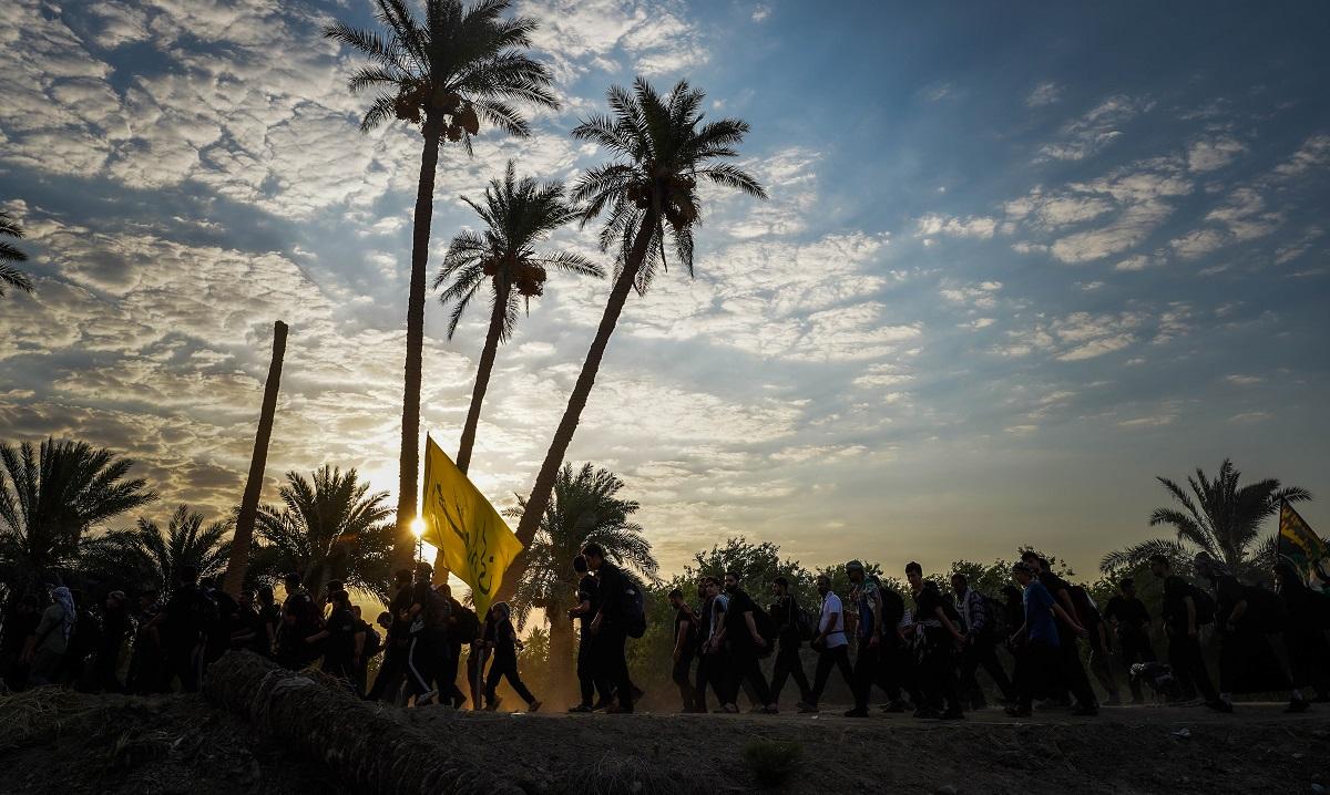 في الخلف، يرسم غروب الشمس الذهبي لوحة خالدة على صفحة مياه الفرات، وكأن النهار يسلّم الليل عهد الوفاء. تتماوج الظلال على الماء كأسرار لا تُقال، فيما الخطى تمضي والعشق الحسيني يمدّ الطريق بمداد من نور.