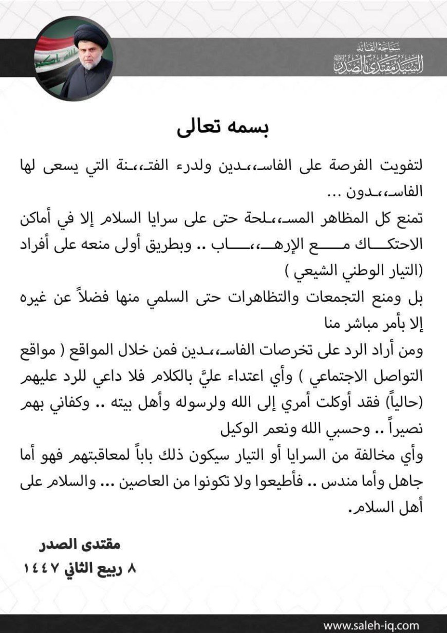 الصدر يصدر توجيهات صارمة: منع كل المظاهر المسلحة ومنع التجمعات دون إذن مباشر