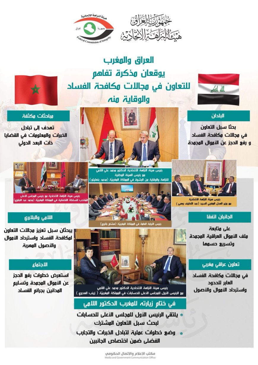 ويُعدّ توقيع مذكرة التفاهم خطوة جديدة نحو تعزيز التعاون العربي في مكافحة الفساد، وتوحيد المواقف في المحافل الدولية، فضلاً عن دعم مساعي بغداد والرباط لتطوير قدراتهما المؤسسية في ميدان الشفافية والنزاهة المالية.