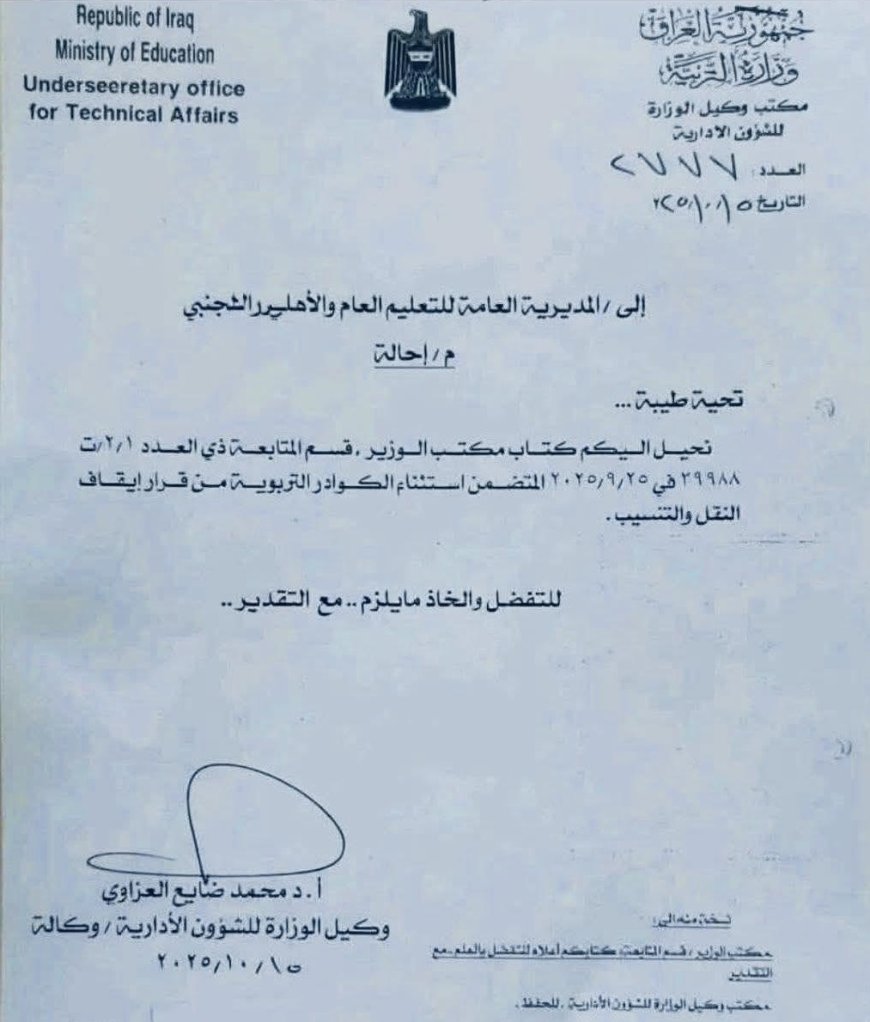 وأوضحت وثيقة صادرة عن مكتب وكيل الوزارة للشؤون الإدارية أن الكتاب الرسمي المحال إلى المديرية العامة للتعليم العام والأهلي والأجنبي تضمّن توجيهاً باستثناء الكوادر التربوية من القرار، استناداً إلى كتاب مكتب الوزير/ قسم المتابعة بالعدد 2/1/ب/29988 في 25 أيلول 2025.