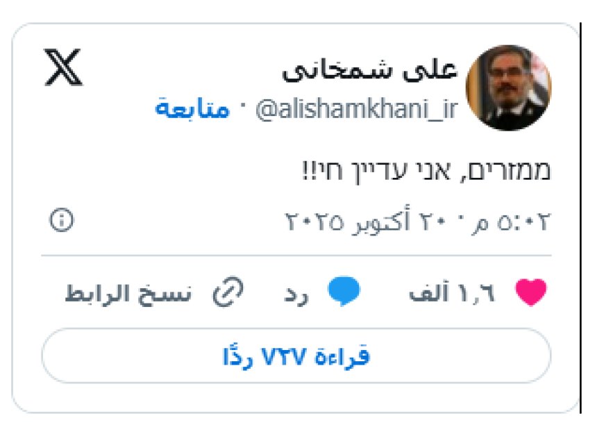 ردّ الأمين العام السابق للمجلس الأعلى للأمن القومي الإيراني، علي شمخاني، على الجدل الدائر حول تسريب مقطع فيديو من حفل زفاف ابنته، برسالة حادة نشرها على منصة “إكس” باللغة العبرية قال فيها: "أيها الأوغاد.. ما زلت حياً"، في ما اعتُبر إشارة موجهة إلى إسرائيل.