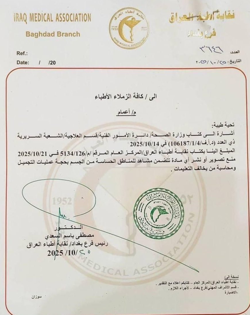 أصدرت نقابة أطباء العراق/فرع بغداد تعميمًا رسميًا وجّهته إلى جميع الأطباء العاملين في مجال التجميل، منعت فيه تصوير أو نشر أي مواد تحتوي على مشاهد للمناطق الحساسة من الجسم تحت ذريعة الترويج أو التوضيح لعمليات التجميل.